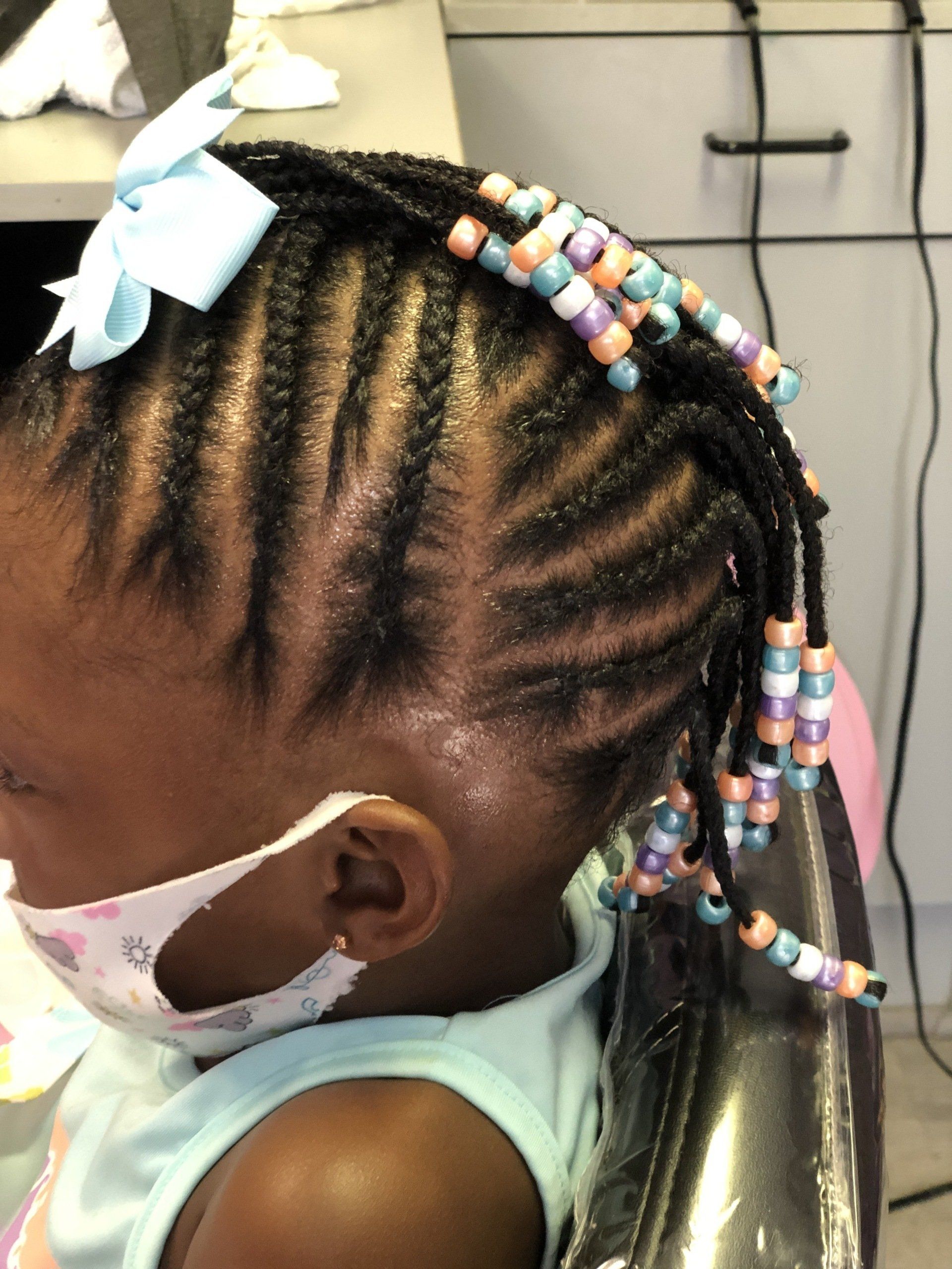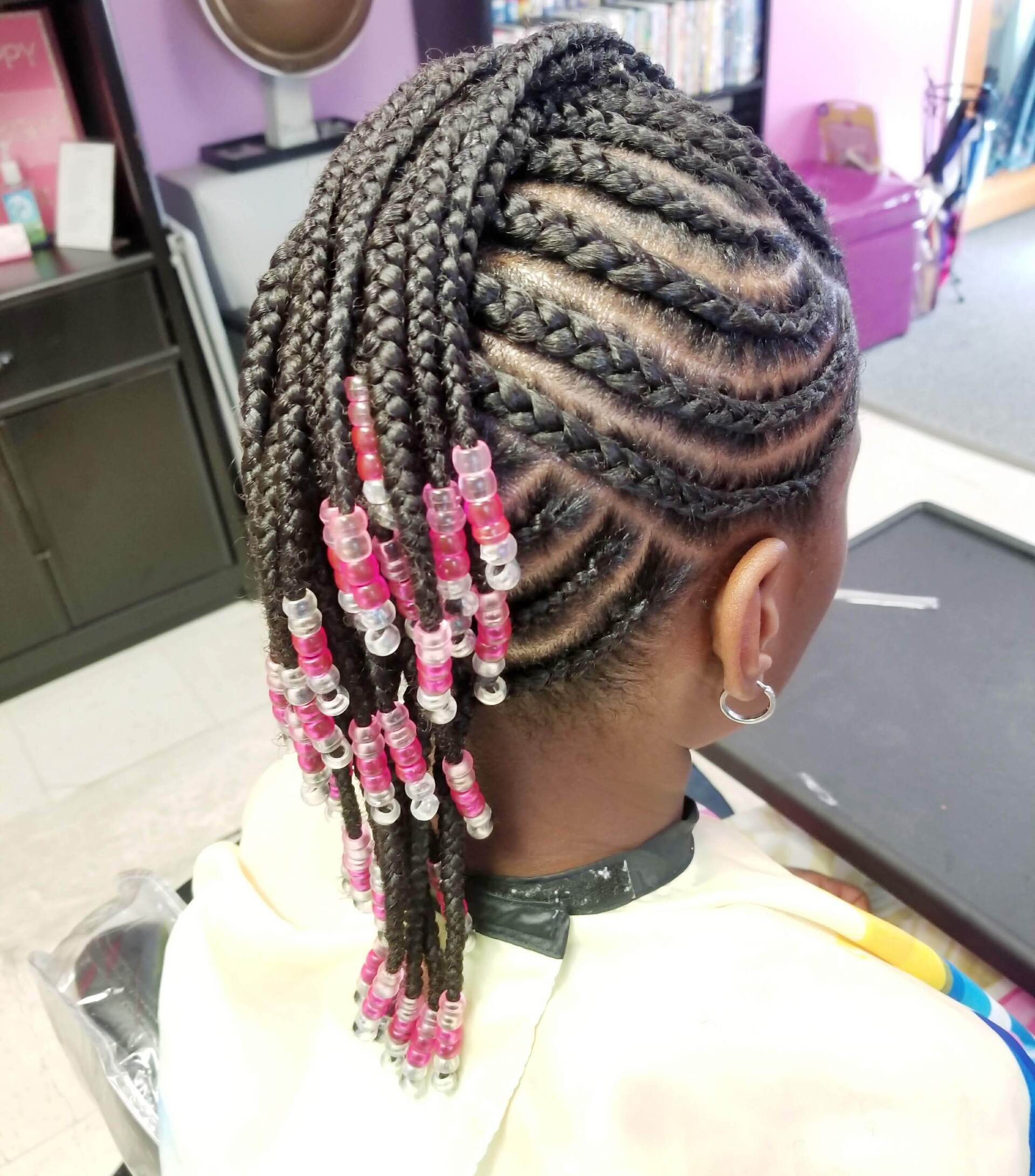 After consultation, shampoo, instant conditioner and blow-dry, hair is cornrowed into a "Mohawk" style. This style can be finished with your choice of beads, curls, or just left plain. This trendy style will easily please your little fashionista.