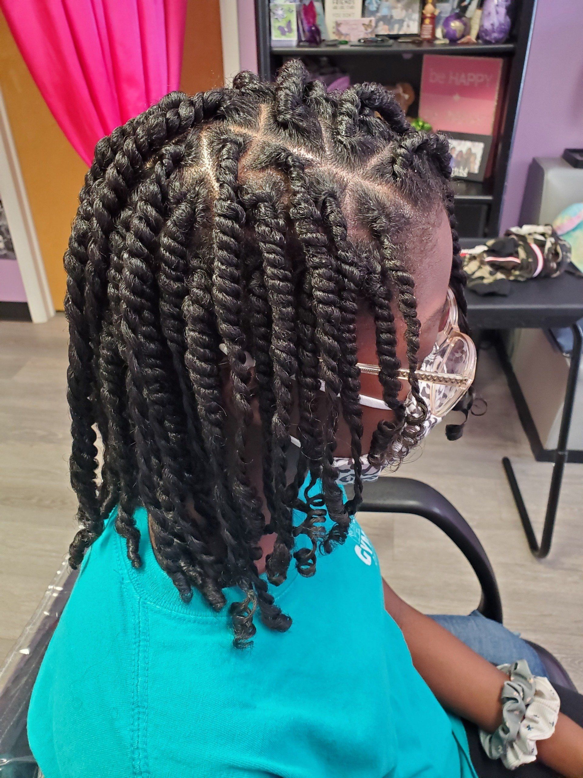 This service provides much more than a simple braid. Hair is cornrowed ending into two strand twists. Note: This style requires sitting under a hooded dryer.