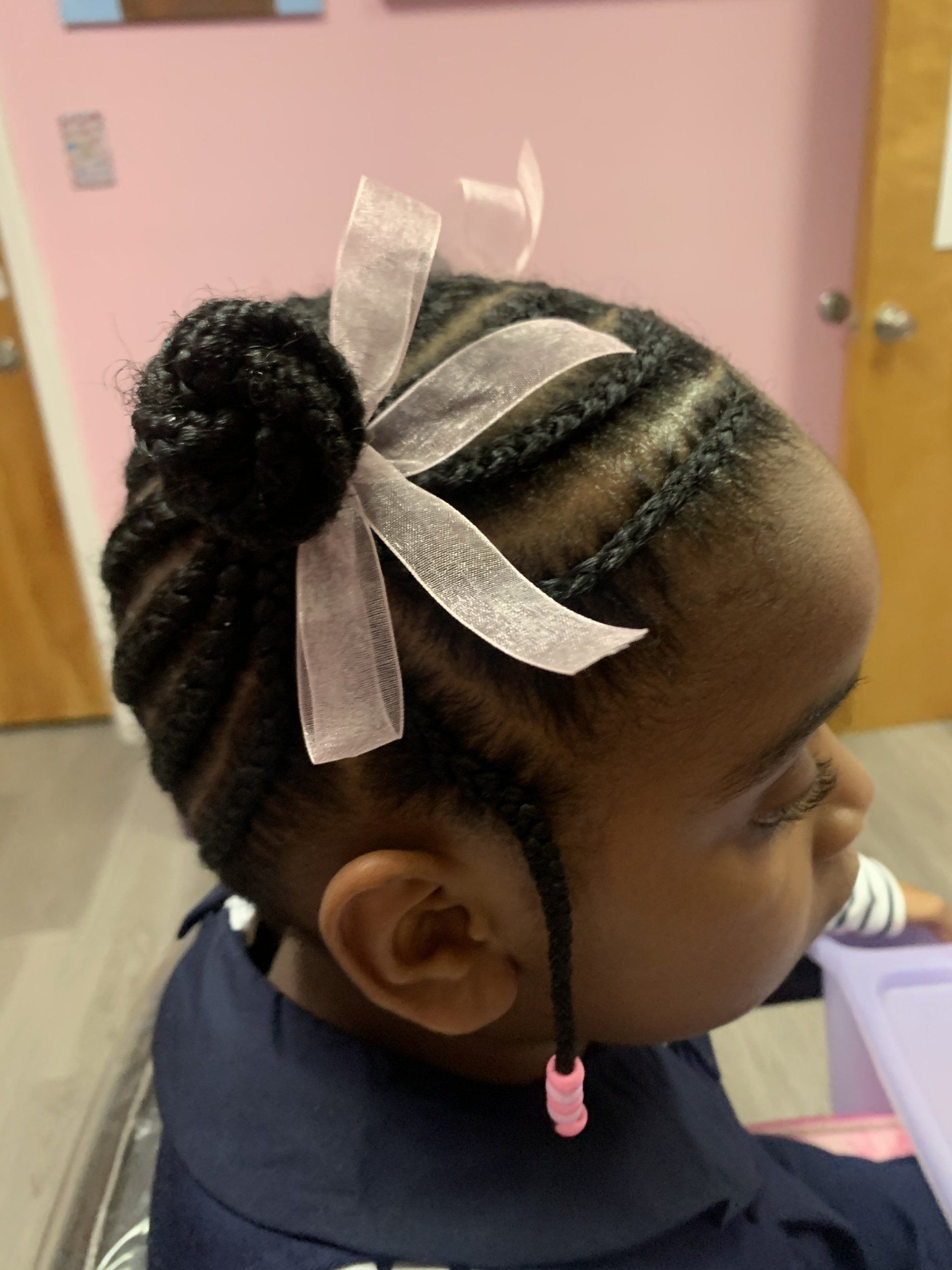 This style is cornrowed up into a "sweet" twisted bun that's oh so fun. Great for everyday play, but sure to accent dance and ballet recital outfits. This style is very convenient for an active little Princess.